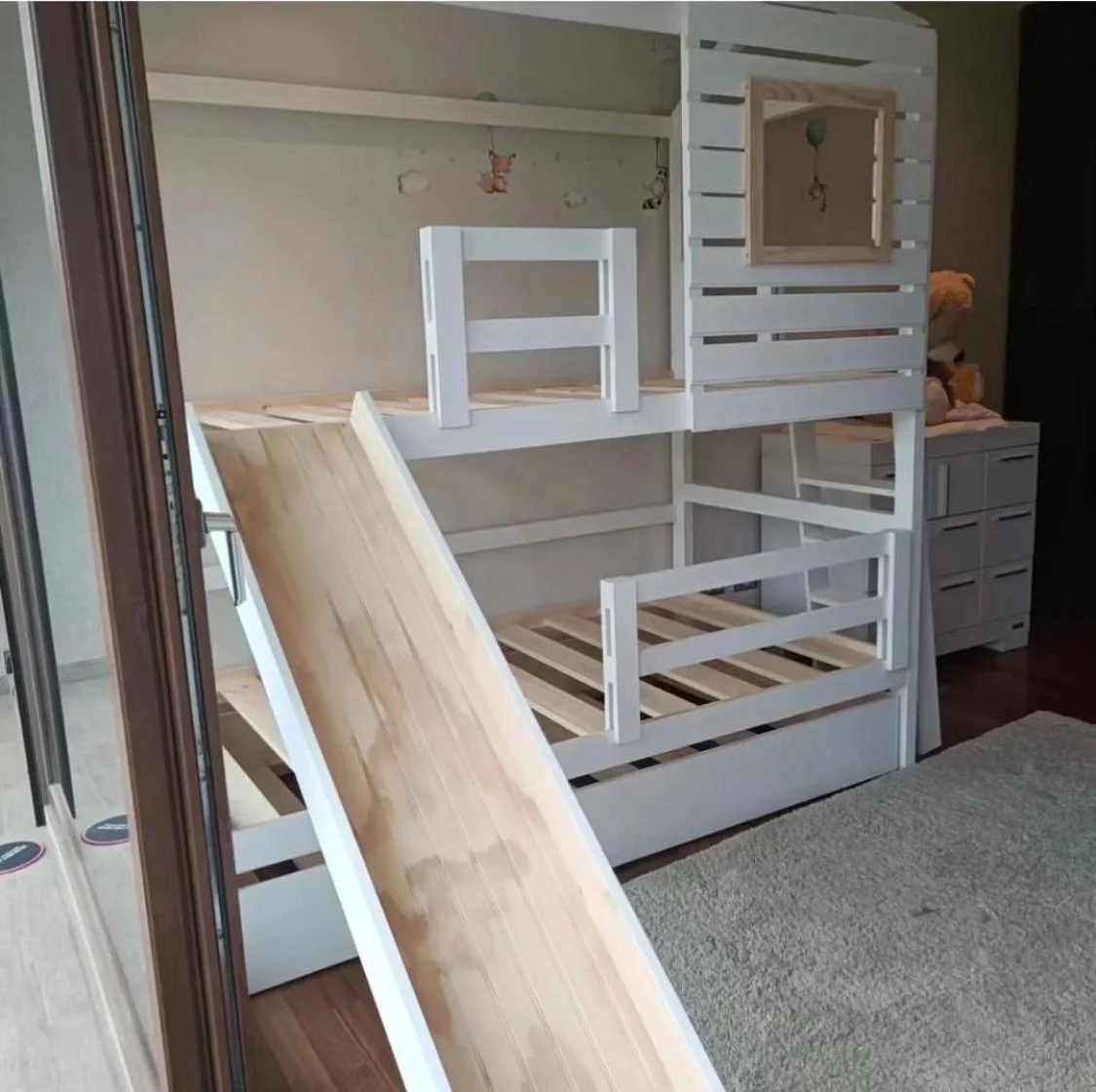 Modern Kids Loft Bed with Slide for Kids is a creative and multifunctional furniture piece designed to turn any child’s bedroom into a fun and practical space. Featuring an elevated loft bed design with a built-in slide, it combines sleeping, play, and space-saving functionality in one stylish structure.